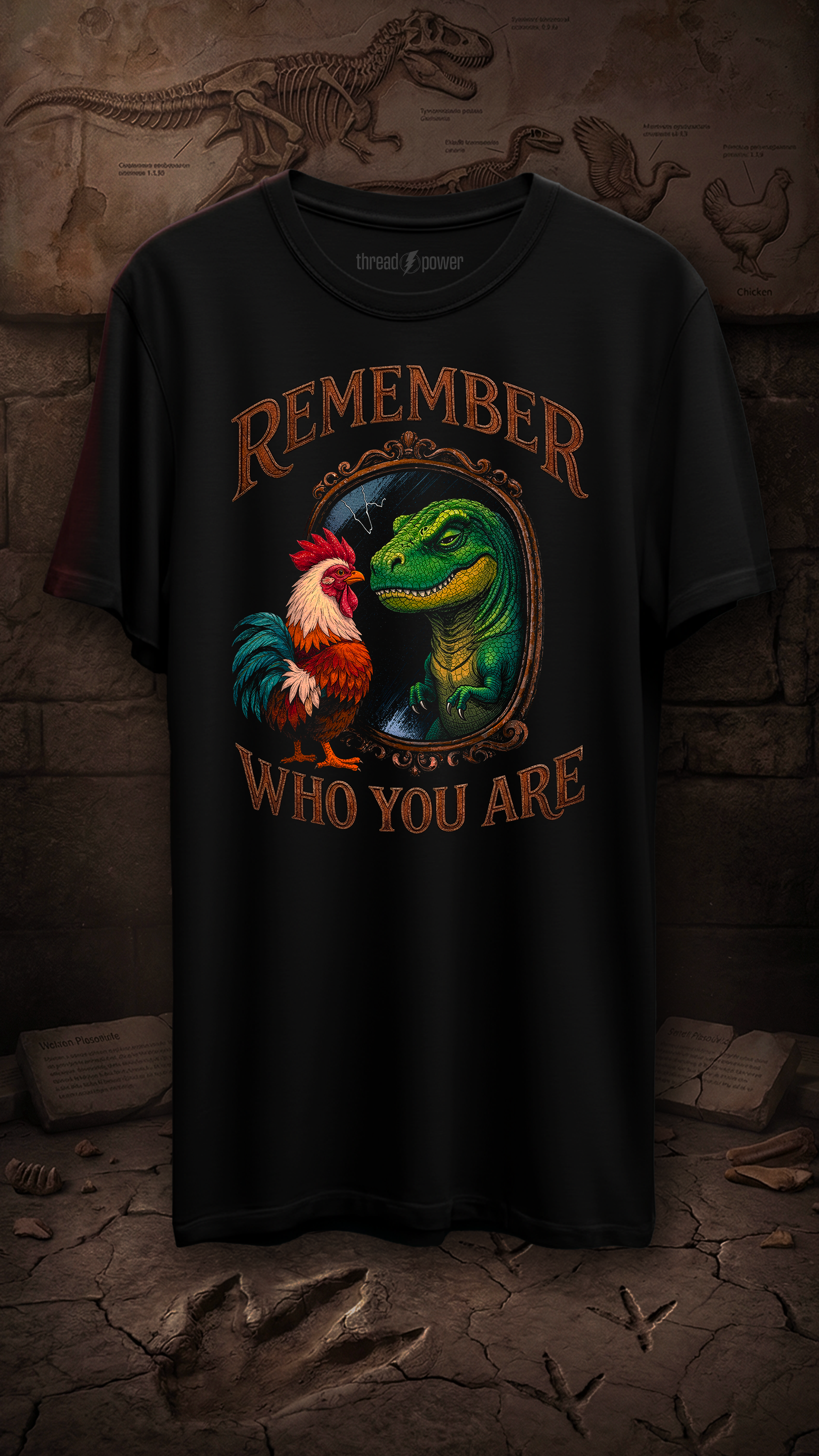 A reminder with a sense of humor. Remember Who You Are pairs a proud rooster and a thoughtful dinosaur in an ornate frame, highlighting the absurdity of forgetting your roots. The design uses rich line work and classic composition to ground the humor in something that feels timeless. It encourages introspection without taking itself too seriously.